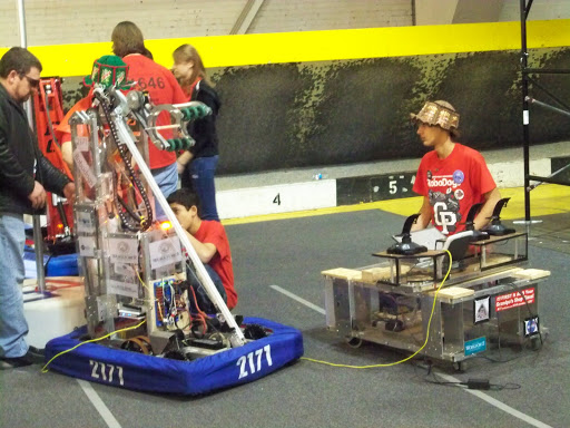 This year’s competition involved the FIRST robots being able to pick up and place giant inflated shapes onto target pegs on a wall. The program is an awesome one, with students actively involved in designing, building and maintaining the robots throughout the competitions.